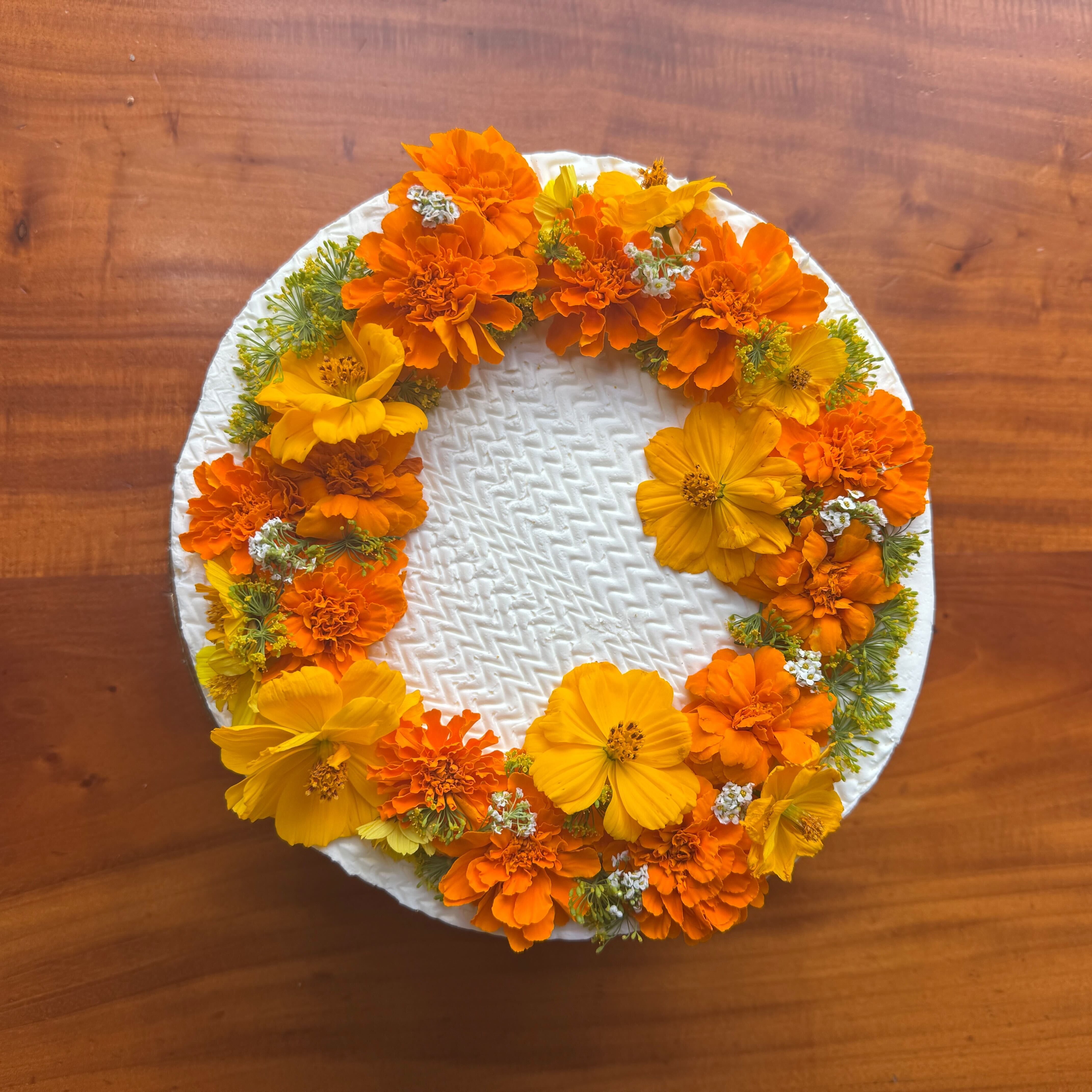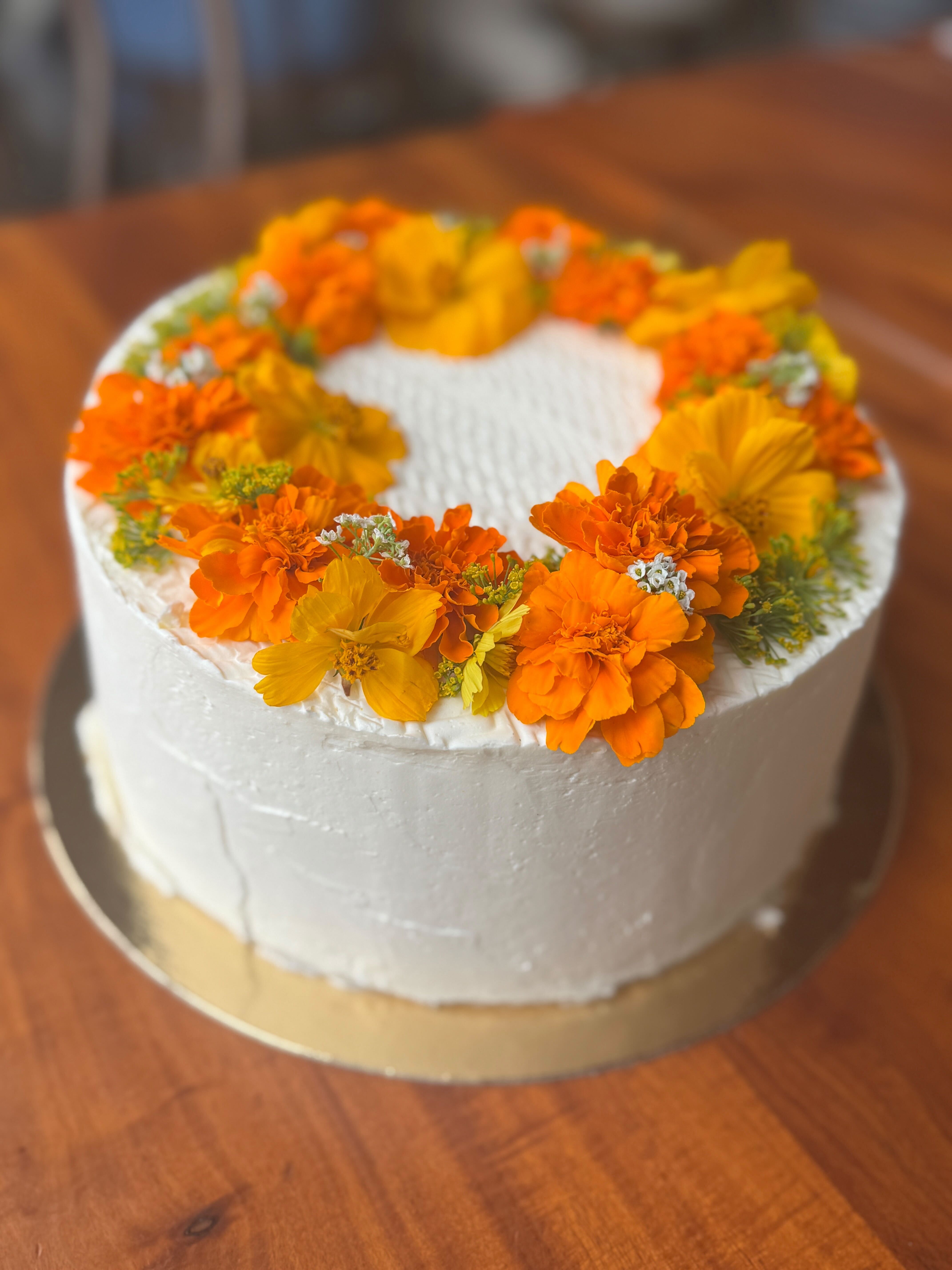 Vanilla sponge cake layered with local elderflower syrup, vanilla bean pastry cream, organic King Grove Blueberry and whipped cream. Finished with a traditional buttercream and ZTB Farmhouse Flowers